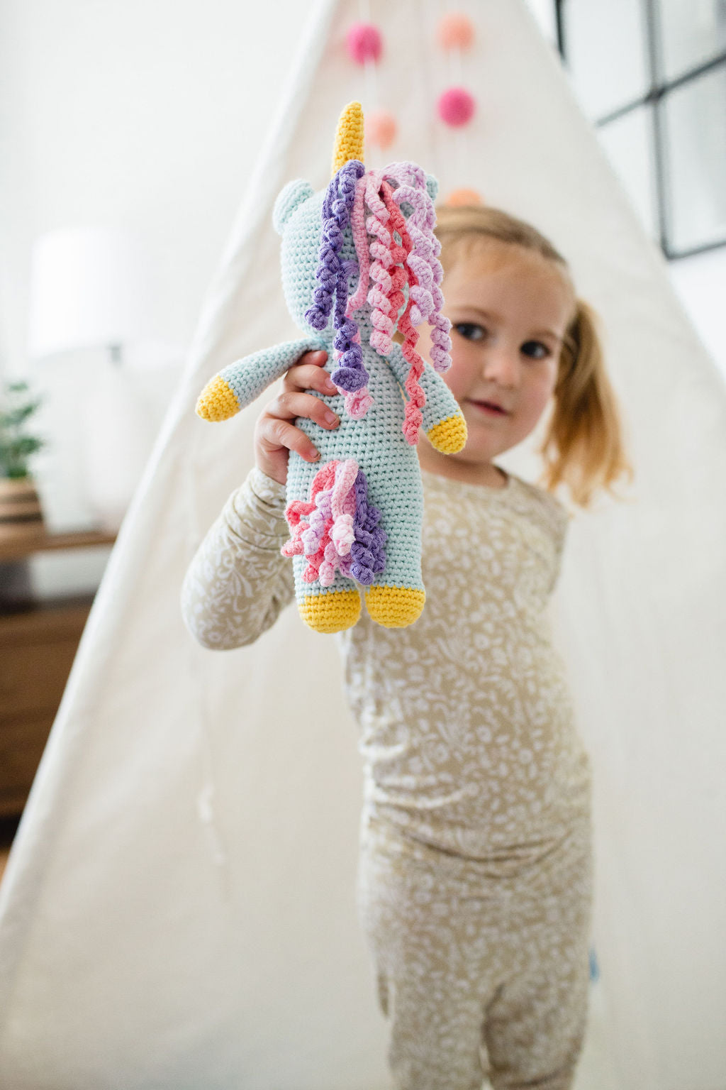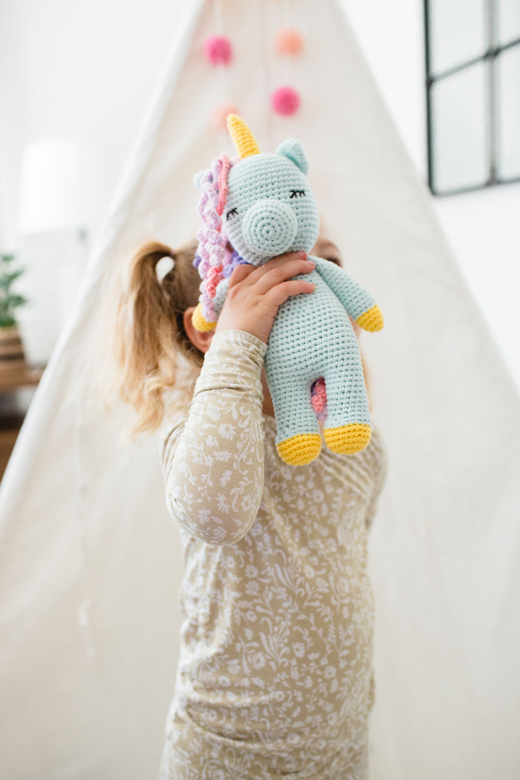 our Sleepover Friend unicorn! Ready for snuggles and sweet dreams, Luna helps kids sleep soundly anywhere, from grandma's house to camping adventures.